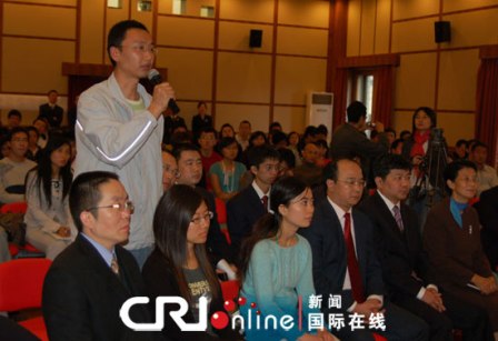 座談會上,留俄學生代表向李輝大使提問。