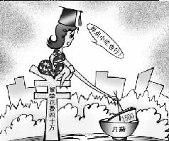 漫畫二:25日報道發出當天,署名李清的搜狐博客貼出題為“只要求月薪1500元的海歸不丟人”的博文,配以頭戴博士帽,以書為翅,勇敢飛向標有1500元月薪飯碗的海歸漫畫。