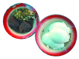在贊比亞,希瑪是人們的主食。贊比亞人吃希瑪,配肉有牛肉、魚肉或雞肉;配菜主要是南瓜葉和卷心菜;有時會澆番茄醬或辣椒醬。當地朋友告訴我,正宗吃希瑪的方法有三步:第一步,將希瑪掰成小塊;第二步,用手指使勁揉搓這一小塊希瑪,直至其黏性喪失,成為球形;第三步,將小希瑪球沾上醬或者配著肉和菜吃下。贊比亞人非常喜歡希瑪的美味,所以吃完后,會用舌頭舔凈每個手指上的殘渣和醬。