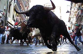 自從海明威的小說《太陽照常升起》問世,特別是他獲得諾貝爾文學獎以后,世界上越來越多的人就知道了西班牙的奔牛節,知道了在那個最浪漫的國度有一種最浪漫的節慶,其宣泄程度遠非任何一種狂歡節可比。想一想斗牛場上那滿身是血、橫沖直撞、兇悍無比的大公牛,如果與它們一起狂奔共舞,而且是成千上萬的年輕人與它們一起瘋狂奔跑在一條狹窄的街道上,那該是何等的刺激!于是,在無數人的想像中,西班牙奔牛節就意味著勇敢、浪漫、刺激和瘋狂的宣泄,同時也必定險象環生。