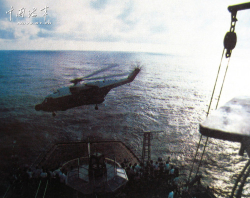 10月12日,天氣格外晴朗。發射導彈試驗任務一切準備就緒。這天下午14時30分,我率領機組人員精神抖擻地快步走到飛行甲板,地勤人員早已將飛機拉出機庫準備好,等待飛行員檢查。 一切良好!我和機組人員充滿信心地跨入駕駛艙,系好安全帶,等待起飛的命令。14時48分,艦上飛行指揮員、團長郭文才向機組發出了“開車”的命令,空中機械師立即啟動發動機,頓時旋翼飛轉、馬達轟鳴。14時53分,指揮員發出了“起飛”的命令,我立即向甲板指揮員發出“解除系留”的信號,“系留已解除!”我立即接通自動駕駛儀,上提變距桿,飛機“刷”的一下離開甲板,低著頭吼叫著離艦起飛。