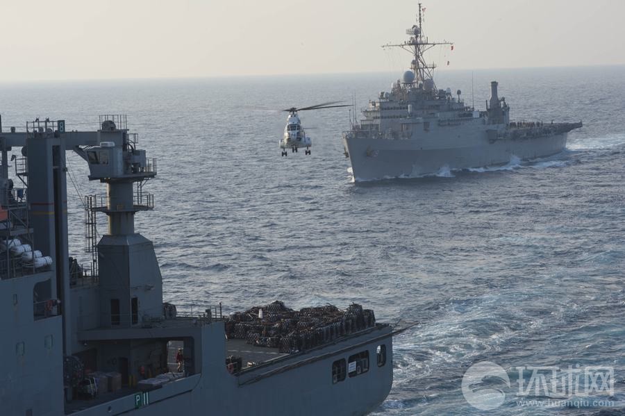 演習中美軍補給艦演練海上垂直補給