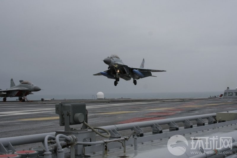 從甲板上拍攝到的艦載機(jī)在維克拉馬蒂亞號(hào)上降落的場(chǎng)景