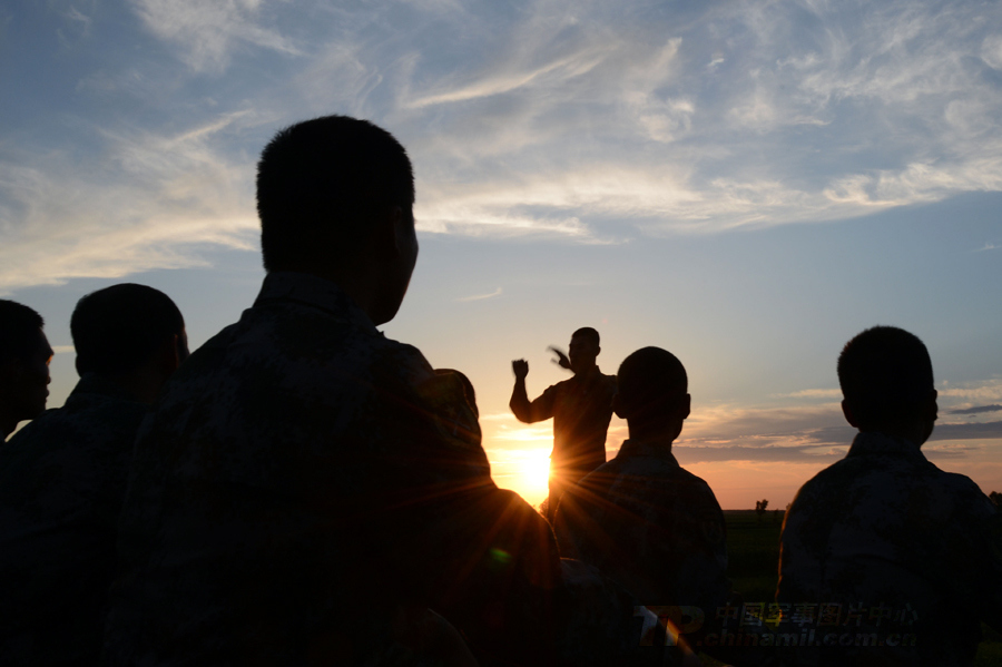 官兵在夕陽下學唱俄羅斯歌曲