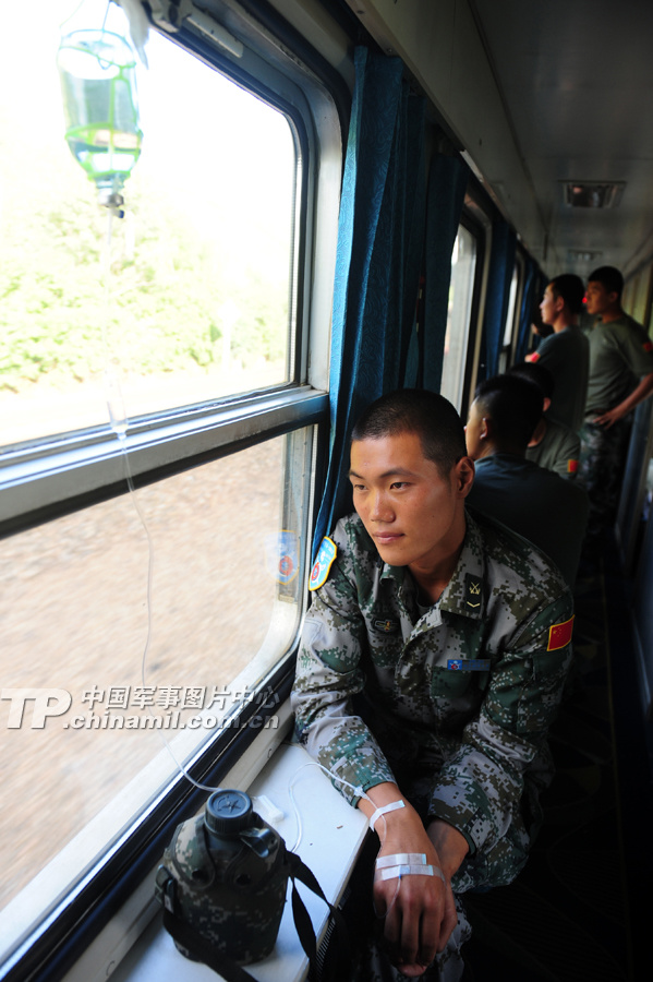 一名戰士在投送列車上打點滴,生病期間他沒落下一次訓練。蓋旭輝 攝