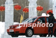 一月冰天雪地的中國汽車名城長春市,將國產新款家用轎車擺放在凈月潭中展示,為新春冰雪萬民游園會的熱銷推介。作者:賈國榮