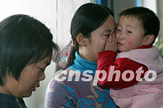 罹難礦工李景玉的女兒與外孫十五日在家中相擁而泣。