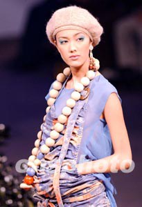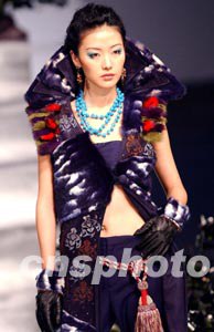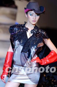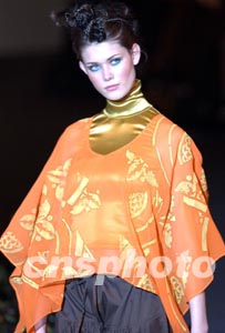 1月17日在香港時裝節舉辦的“香港青年時裝設計家創作表演賽2003”上,模特展示青年時裝設計師才華橫溢的時裝作品。中新社傳真 洪少葵 攝