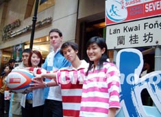 “香港國際七人欖球賽”將于3月底于香港大球場舉行,1月23日模特在中環蘭桂坊展示今屆欖球賽的服飾。洪少葵 攝