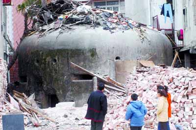 記者聞訊趕到現場,在金惠公寓門前拆遷房的殘垣斷壁間,赫然立著一座堅實的圓頂碉堡。碉堡的小半截埋在地下,露在外面的大半截約有三四米高,外徑十米多,壁厚1米,內徑8米多。碉堡的四面石壁上,均勻地排布著12個步槍射擊孔和6個機槍射擊孔。低頭鉆進碉堡,記者發現,里面是個有兩層樓高的小洞天。碉堡圓心處豎著一根粗大的承重石柱,石柱邊,有個鐵梯。順著梯子可以爬到頂部,頂上有個洞,人可以從那兒鉆出去。