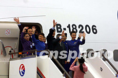 載有春節返鄉探親臺商及其眷屬的臺灣“華航”包機,一月二十六日上午十一時三十分左右從上海浦東機場順利起飛。圖為“華航”機組人員起飛前揮手作別。
