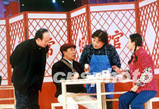 小品老搭擋郭達(左一)、蔡明(右)與李文啟、李小梅將在2003年中央電視臺春節聯歡晚會中表演小品《都是親人》,探討尊老敬老話題。作者:王新