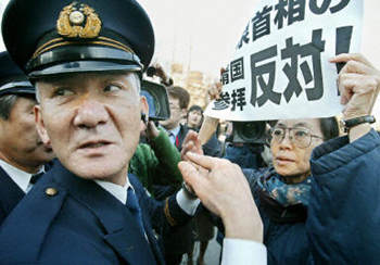 2001年8月13日,日本戰敗紀念日前兩天,小泉第一次參拜靖國神社。他的第二次參拜是在2002年4月。此舉同樣遭到亞洲各國的譴責。(章田)