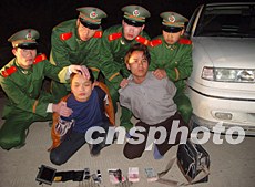 二十八日下午,五名持槍劫匪在福建長樂市持槍搶劫得逞后駕車逃逸,設卡攔截的長樂松下邊防官兵駕車緊追并當場奮勇擒獲兩名持槍嫌犯,繳獲自制手槍一支(內裝兩發子彈)、匕首、轎車和手機及贓款兩萬余元人民幣。當晚十二時許,同案在逃的另三名劫匪在福清市落網。作者:陳如冰