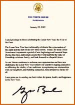 布什總統二十九日發布賀詞說,農歷新年的傳統是慶祝大地復蘇和新的耕作時節的開始。如今,對于許多美國亞裔來說,它標示著新開端和新希望的降臨。在這段時間里,世界各地的人們重新確認友誼的價值,慶祝家庭團圓,期待著一個充滿希望的未來。