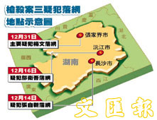 中新網(wǎng)2月5日電元月31日凌晨,經(jīng)湖南省公安廳和張家界市警方周密布控,公安部督捕、震驚粵港湘三地的香港陸羽茶室“11·30”槍殺富豪林漢烈案主要嫌兇楊文在張家界市落網(wǎng)。至此三名嫌兇全部落網(wǎng)。香港文匯報今天刊載了槍殺案三疑犯落網(wǎng)地點示意圖。