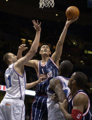 姚明在比賽中突破對方立陶宛籍中鋒伊爾高斯卡斯的防守后單手上籃。