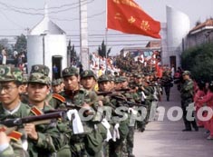 解放軍軍事經濟學院的學員隊伍新春展開行軍演練,途中在湖北省谷城縣受到百姓官員夾道歡迎。作者:王偉兵
