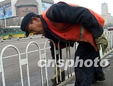 二月底,北京環衛工人認真清洗首都主要街道上的護欄,為即將召開的“兩會”營造整潔環境。作者:盛佳鵬