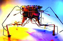 在模仿登陸火星的試驗中,一輛漫游車攜帶的機器蜘蛛臨時替代出故障的無線電設備將信息傳送回總部。這個大出風頭的機器蜘蛛,便是美國宇航局噴氣推進實驗室設計的昆蟲式機器人,它擁有異常靈活的腿,能跨越障礙,攀登巖石,探訪其他靠輪子滾動前進的機器人無法抵達的區域。