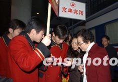 從二月二十七日早上開始,參加全國政協會議的委員陸續抵達北京。早上七時許,賓館工作人員在北京西站迎接來自湖北的政協委員。作者:張煒