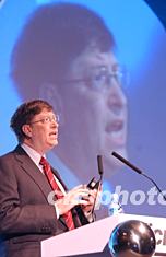 二月二十七日,微軟公司董事長比爾·蓋茨在北京微軟合作伙伴解決方案日上作專題演講。作者:趙振清