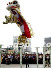 黃飛鴻獅藝武術(shù)隊(duì)三月初在廣州為市民進(jìn)行醒獅表演,以紀(jì)念一代宗師黃飛鴻在廣州西關(guān)設(shè)館一百四十周年。作者:劉衛(wèi)勇