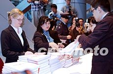 匯豐股控有限公司3月3日公布2002年全年業績,傳媒爭先在記者會上領取匯豐股控有限公司2002年全年業績報告,以第一時間發布新聞。洪少葵 攝
