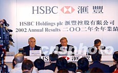 匯豐股控有限公司3月3日公布2002年全年業績,匯豐控股有限公司集團行政總裁韋志誠爵士〈中〉在記者會上公布詳情。洪少葵 攝