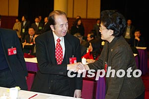 出席全國政協十屆一次會議的港澳委員七日在北京政協禮堂舉行聯組會,中共中央統戰部部長劉延東向出席會議的何鴻燊表示問候。作者:毛建軍