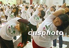 “白蘭氏”與香港各界婦女聯(lián)合協(xié)會,三月八日在香港舉行“百人紓壓瑜伽日”活動。圖為眾多女士練瑜伽功。錢興強(qiáng) 攝