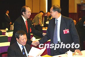 正在北京出席全國政協十屆一次會議的何鴻燊與鄒哲開在港澳政協委員聯組會上互致問候。作者:毛建軍