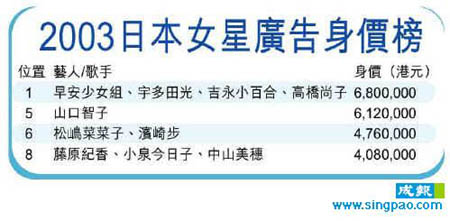 至于兩位叱咤樂壇的歌姬濱崎步及宇多田光,前者靠百變形象,成功令三百四十萬的身價,上升多一百三十六萬港元。而光妹則以低調(diào)及神秘感取勝,成為廣告一姐。事實上,據(jù)最新一期雜志《女性自身》報道,光妹婚后明顯發(fā)福,也與其深居簡出的生活習(xí)慣有關(guān)。
