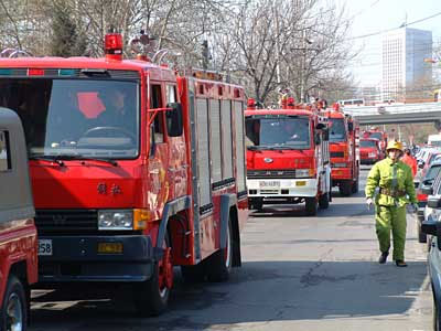 北京警方聞訊后在五分鐘內趕到現場。記者在現場看到,目前通往盛福大廈的各個路已被警方嚴密封鎖,方圓數里內聚集了大批警察及保安人員。許多消防車也聚集在那里,以防爆炸引起的火災。在附近的道路上,不時有警車穿梭往來。