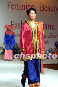 十二日,美、英、法等22國駐滬領事夫人們齊聚東華大學,參加主題為“女性之美,服裝之魅”文化交流活動。活動中領事夫人們還興致勃勃的走上T臺展示各自獨具魅力的民族服飾。圖為領事夫人們在展示民族服飾。作者:湯彥俊