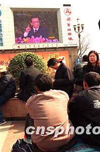 眾多民眾十八日在北京車站廣場,通過大屏幕關注新總理溫家寶在新聞發布會上的講話。作者:鄒憲