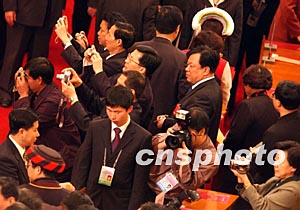 人大代表們三月十八日在北京參加全國人大十屆一次會議的閉幕大會前,紛紛拍照留念。作者:賈國榮