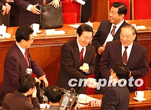 十屆全國(guó)人大一次會(huì)議三月十八日在北京閉幕時(shí),王兆國(guó)副委員長(zhǎng)上前與朱镕基握手致意。作者:賈國(guó)榮