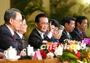 三月十八日,十屆全國人大一次會議閉幕后,新任國務(wù)院總理溫家寶和四位副總理一起與中外記者見面。作者:張煒