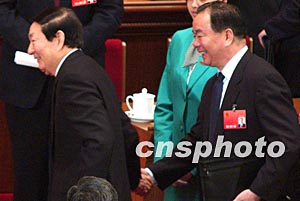 十屆全國(guó)人大一次會(huì)議三月十八日閉幕后,王樂泉代表握住朱镕基的手久久不愿放開。作者:張煒