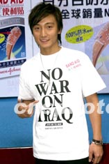 歌星方力申3月18日在香港出席一宣傳活動,身穿印有NO WAR ON IRAQ字樣的T恤,希望戰事不會爆發。中新社傳真 鄧慶樂 攝
