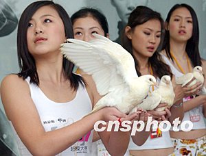 正值伊拉克戰爭之際,在廣州參加“納愛斯雕牌2003超級模特選拔賽”的佳麗,手捧和平鴿祈盼世界和平、反對戰爭。作者:錢興強