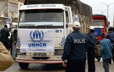 圖:聯(lián)合國難民署救援車隊到達土伊邊境