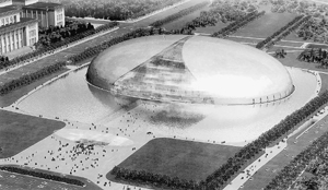 國家大劇院由法國建筑師保羅·安德魯主持設計,設計方為法國巴黎機場公司。國家大劇院建筑屋面呈半橢圓形,由具有柔和的色調和光澤的鈦金屬覆蓋,前后兩側有兩個類似三角形的玻璃幕墻切面,整個建筑漂浮于人造水面之上,行人需從一條80米長的水下通道進入演出大廳,通道兩側被規劃為藝術博物館、藝術品商場等。大劇院造型新穎、前衛,構思獨特,是傳統與現代、浪漫與現實的結合。這座“城市中的劇院、劇院中的城市”計劃在2005年以一顆獻給新世紀的超越想象的“湖中明珠”的奇異姿態出現。