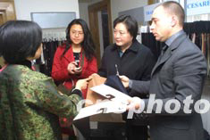 正在北京舉行的2003中國國際時裝周為中外企業洽談生意牽線搭橋。圖為中國企業家與意大利面料供應商洽談生意。作者:史利