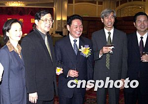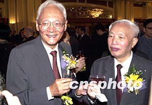 何厚鏵、王漢斌、馬萬祺、萬國權、魯平、郭東坡、白志健、萬永祥等在酒會上祝酒。作者:李剛
