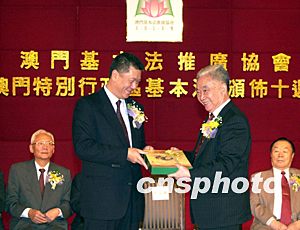 澳門特區行政長官何厚鏵在酒會上向前來出席紀念活動的原全國人大常委會副委員長王漢斌致送紀念書冊。作者:李剛