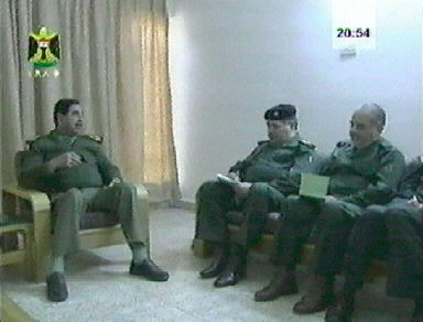就在美英聯(lián)軍逼近巴格達(dá)之際,伊拉克電視臺(tái)3日晚播放了薩達(dá)姆主持一個(gè)會(huì)議的畫面。薩達(dá)姆身穿軍裝,顯得平靜而有條不紊。