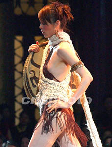 北京與香港合作的一家服飾公司年輕的設計總監金光,新春展示他從中國古幣獲得靈感的鏤鑲時裝。作者:賈國榮