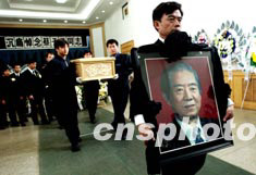 前臺盟中央主席蔡子民先生的遺體四月二十一日在北京火化,蔡先生的長子手捧遺像和眾親友一起最后送別父親。作者:鄭萍萍